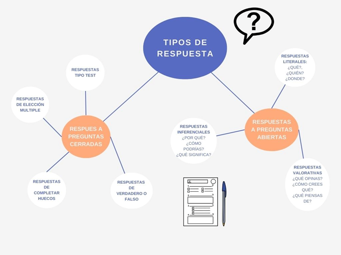 Y por otro lado te puedes encontrar las preguntas abiertas, donde serás tú el que redacte lo que quieres contestar a la pregunta plateada, a partir de tus ideas y reflexión sobre la cuestión. Te puedes encontrar las preguntas literales donde tendrás que contestar a preguntas como ¿Qué?, ¿Quién?....